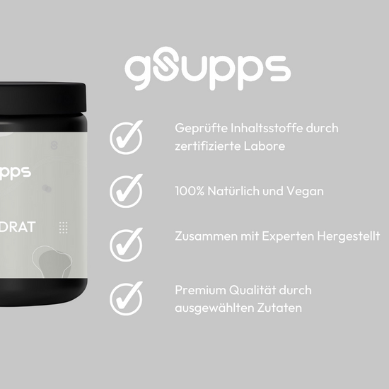 Bei gSupps setzen wir auf höchste Qualität und Reinheit in jedem unserer Produkte. Unser Kreatin Monohydrat besteht zu 100 % aus reinem, mikrofein verarbeitetem Kreatin – ganz ohne Zusätze, Füllstoffe oder versteckte Inhaltsstoffe. Wir verwenden ausschließlich hochwertiges Kreatin mit optimaler Bioverfügbarkeit, um eine schnelle Aufnahme und maximale Wirksamkeit im Körper zu gewährleisten.